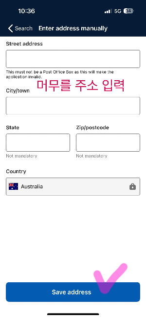 이제 호주에서 머물 숙소의 주소를 입력하시면 됩니다. 주소를 모르신다면 이유도 설명해야 합니다.
