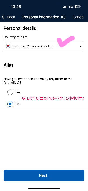 개명여부를 확인하고 본인의 한국 주소와 핸드폰번호를 입력합니다.